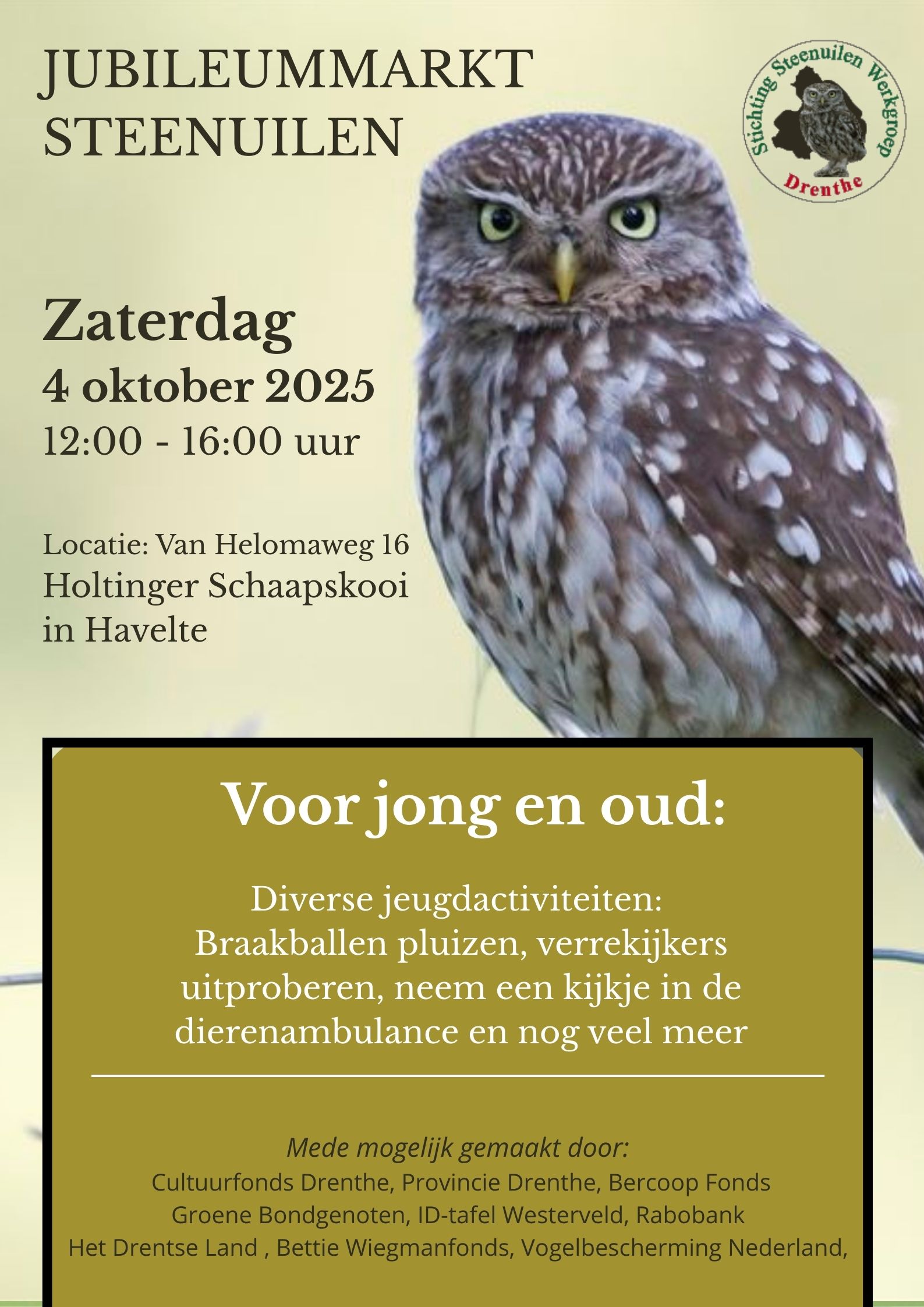 Op zaterdag 4 oktober 2025 viert de Steenuilenwerkgroep Drenthe haar 25-jarig jubileum met een feestelijke Jubileummarkt bij de Schaapskooi in Havelte.